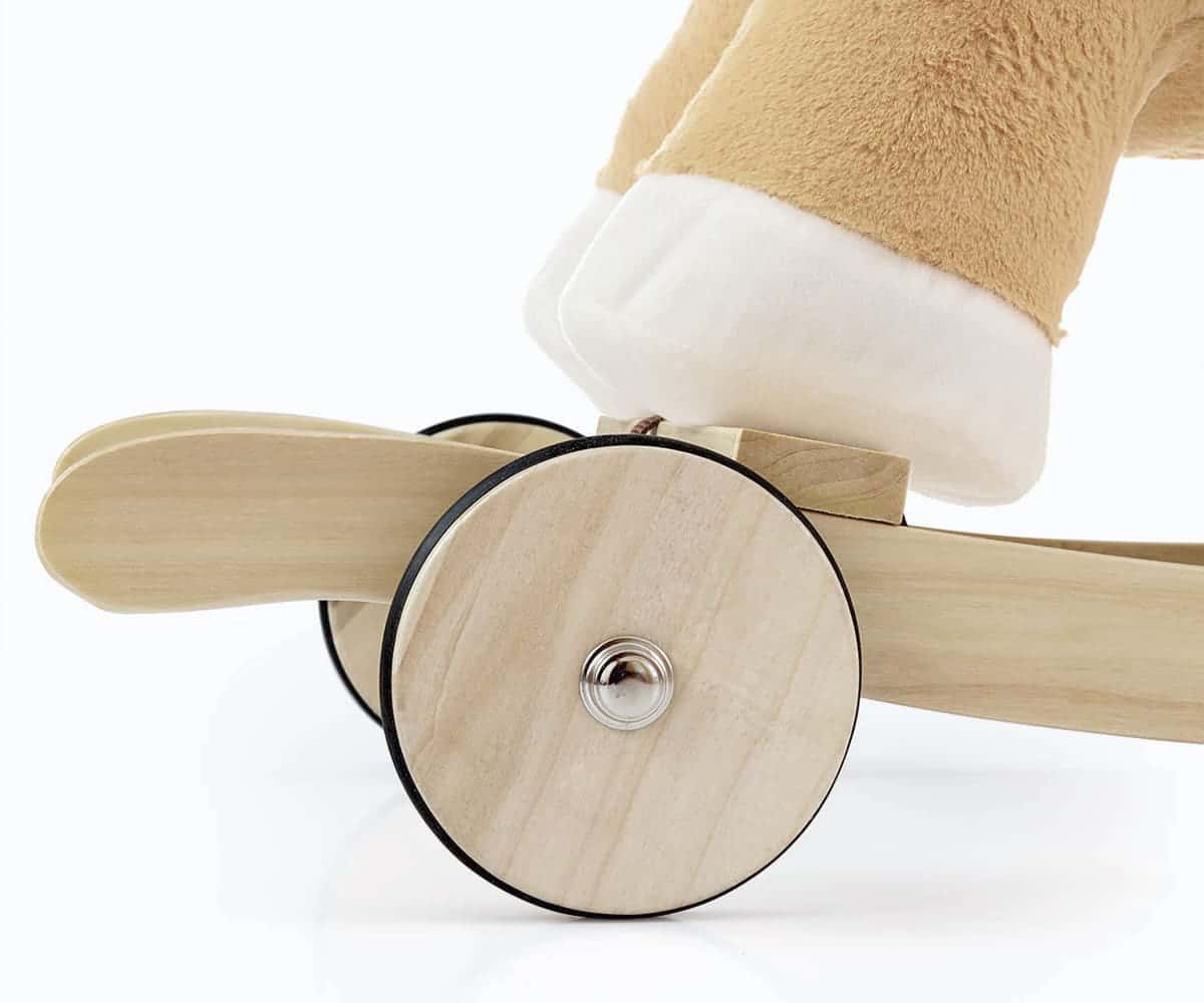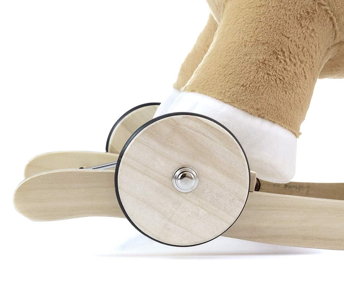 ✔️ To niezwykle proste! Pod płozami znajdują się składane kółka, które można szybko rozłożyć bez użycia narzędzi. Wystarczy obrócić je o 90 stopni, by wystawały poniżej poziomu płóz, a konik z bujaka zamieni się w jeździk. To zajmuje dosłownie kilka sekund i nie wymaga żadnej specjalistycznej wiedzy – każdy rodzic poradzi sobie z tą operacją.