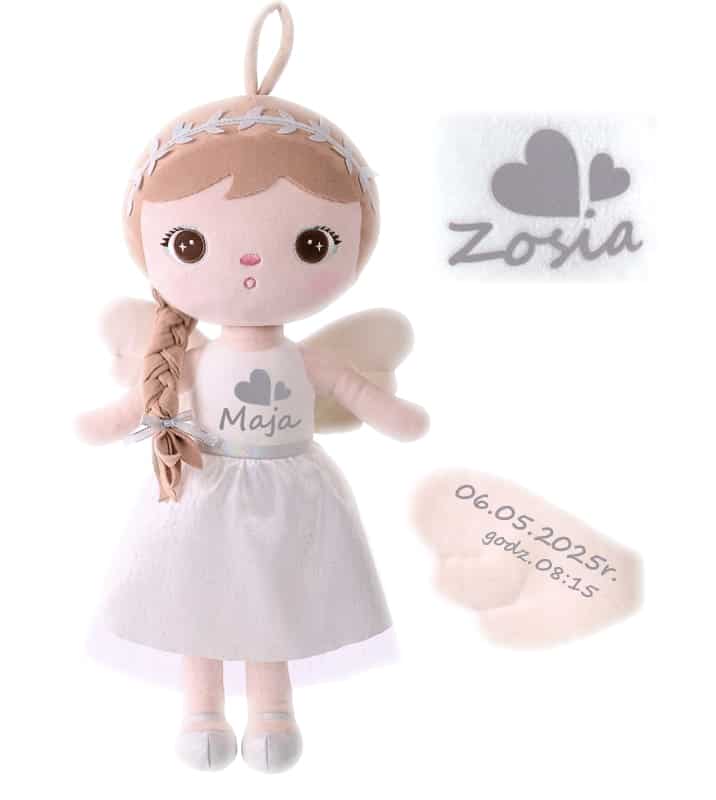Czy jest coś bardziej wzruszającego niż ten moment, gdy maleńkie rączki Twojego dziecka pierwszy raz obejmują wyjątkowego aniołka stworzonego specjalnie dla niego? Ta urocza przytulanka z delikatną białą sukienką, miękkimi skrzydełkami i starannie zaplecionym warkoczem natychmiast stanie się najukochańszym skarbem Twojego maleństwa. Aksamitnie miękki materiał, ciepłe czekoladowe spojrzenie i personalizacja z imieniem oraz pełną metryką narodzin sprawiają, że ten aniołek to nie tylko zabawka, ale pamiątka na całe życie. Idealny prezent na chrzciny, który będzie przypominał o tym wyjątkowym dniu!